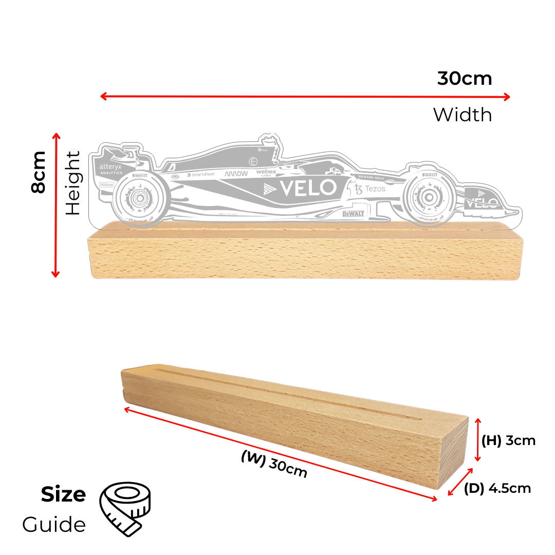 LED Lamp of Lando Norris' MCL36 F1 car. The artwork is engraved on Acrylic, which slots into a high quality Beech wood base with LED lighting.